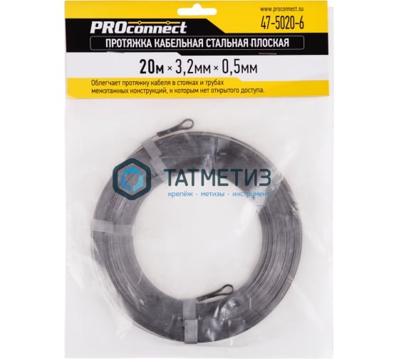 Кабельная протяжка (стальная плоская) 20 метров PROCONNECT 47-5020-6 используется для безопасного протягивания кабелей. На концах протяжки имеются петли для удобства работы. Стальная полоса имеет высокую предельную разрывную нагрузку, что значительно упрощает протягивание кабелей.