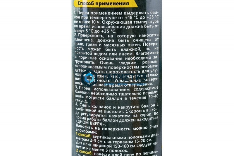 СОСТАВ: полимерный дифенилметандиизоцианат, смесь простых полиэфиров, пластификаторы, углеводородный пропеллент, диметиловый эфир, стабилизатор, промоутер адгезии, катализатор.